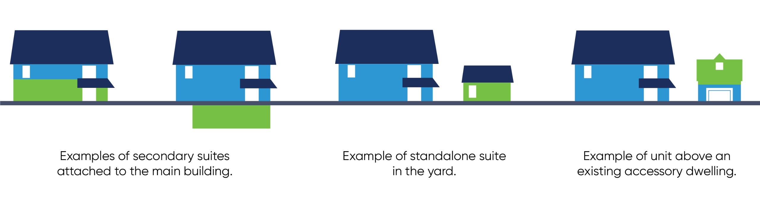 Below are examples of different types of ADUs. Our project will include pre-approved housing designs for a standalone suite in the yard (such as a carriage house, garden suite, or backyard suite).